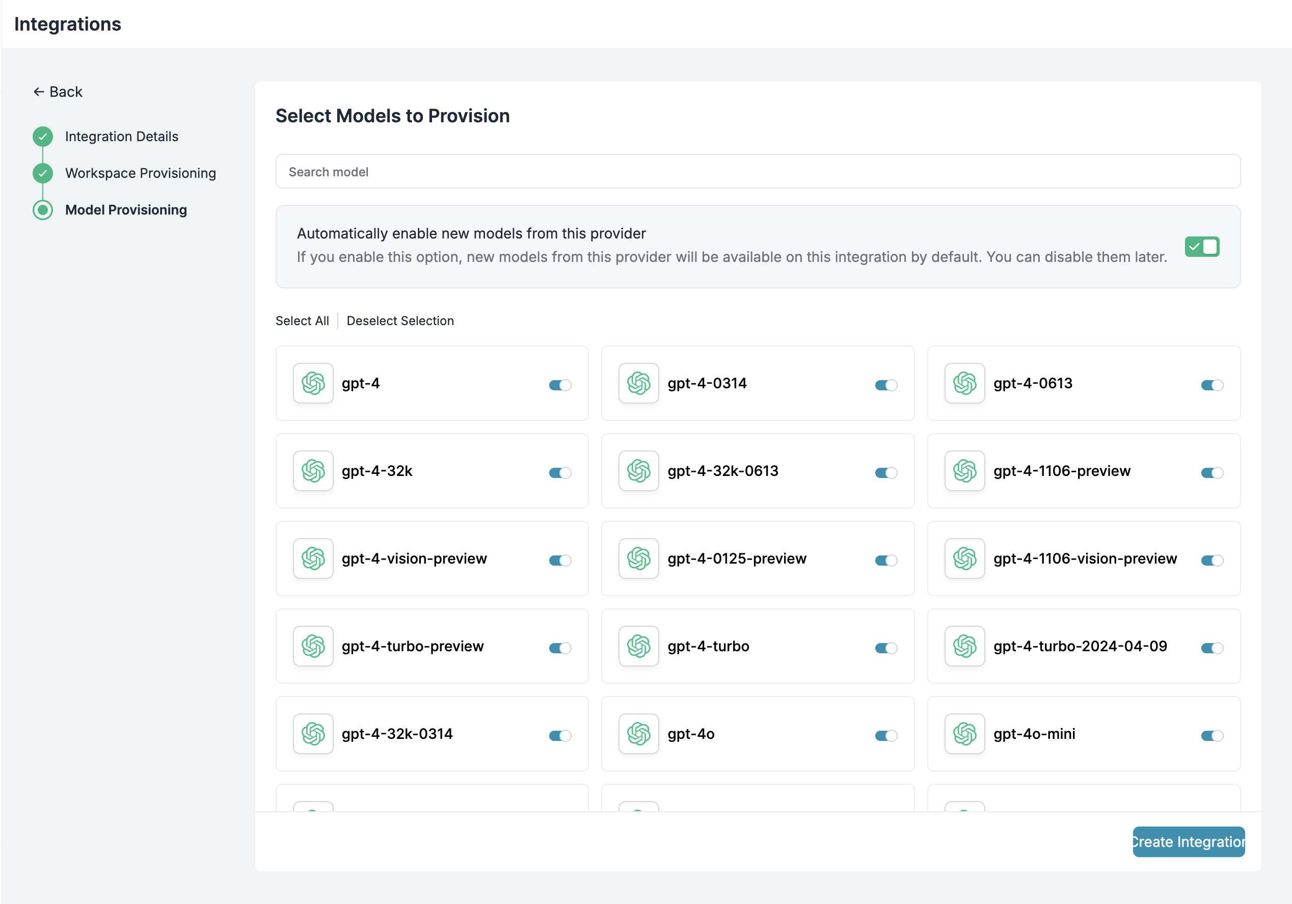 As your AI usage scales, controlling which teams can access specific models becomes crucial. You can simply manage AI models in your org by provisioning model at the top integration level.
