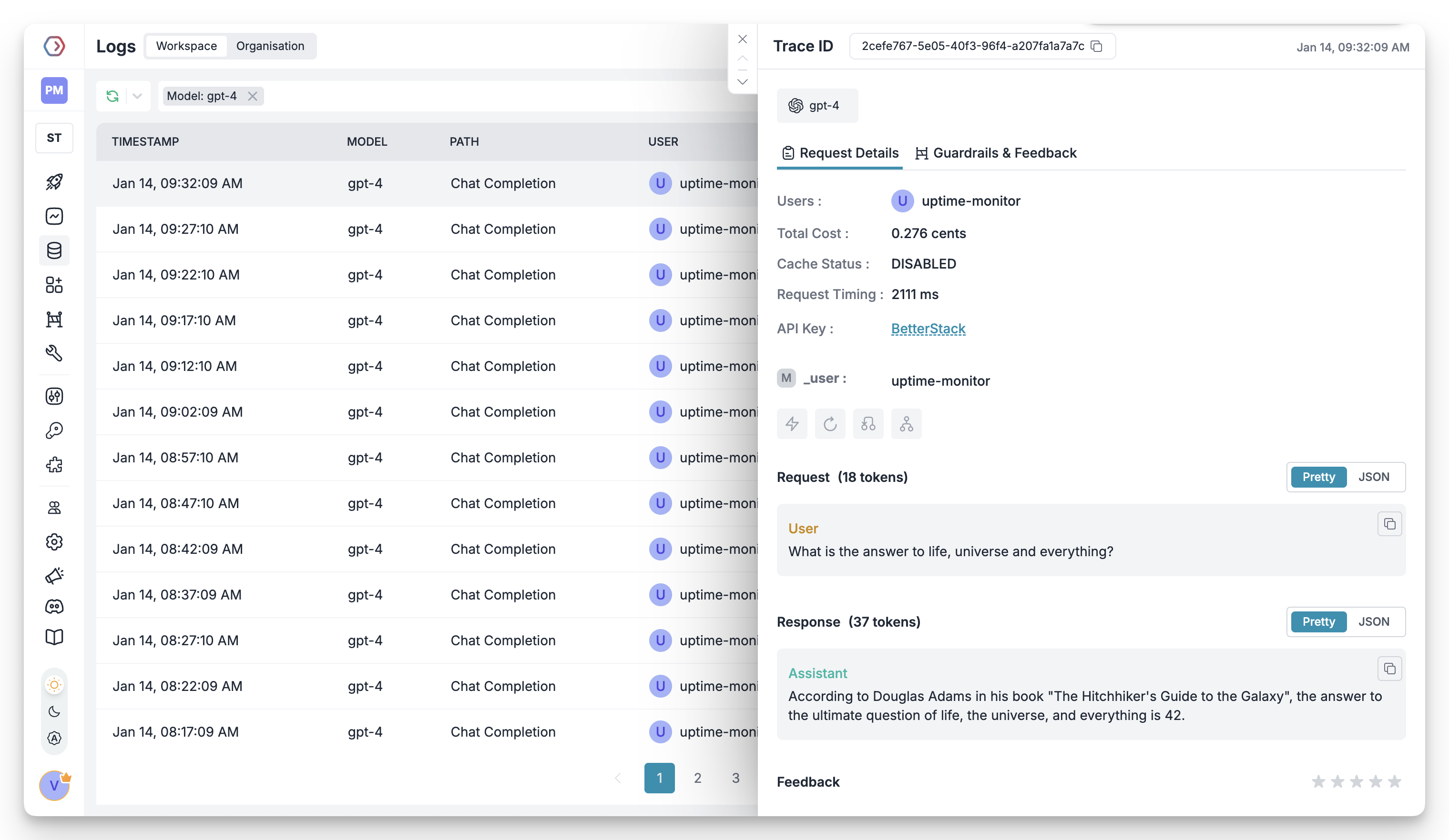 Portkey’s logging dashboard provides detailed logs for every request made to your LLMs. These logs include:- Complete request and response tracking